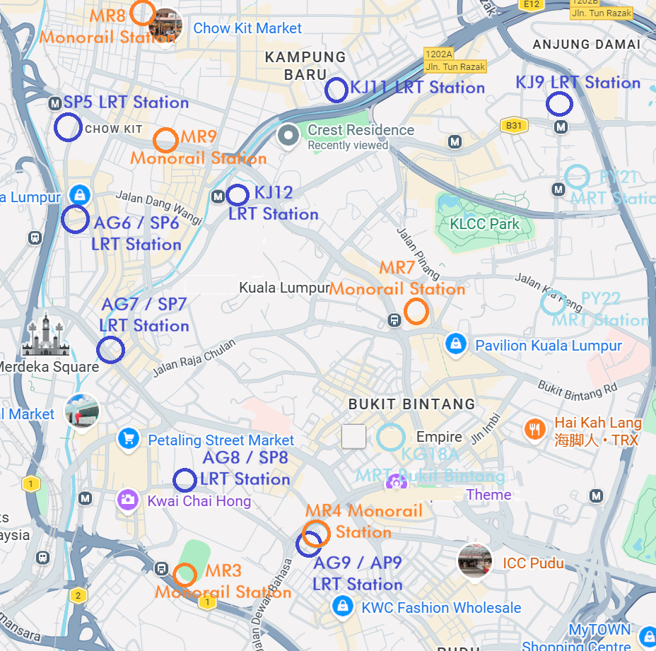KLCC is directly served by the Ampang Park LRT Station (KJ11) on the Kelana Jaya Line. Within the same radius, you’ll also find Kampung Baru (KJ9), Dang Wangi (KJ12), and Masjid Jamek (KJ13), giving a total of five LRT stations.