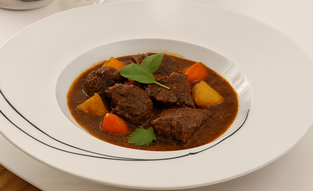 Once the meat is ready, olive oil carries the sweetness of onions and the sharpness of garlic into the pot, creating a savory base that feels both familiar and grounding. Carrots bring their natural sweetness, potatoes add heartiness and comfort, and beef broth ties everything together with richness. As the stew simmers, the flavors meld, the meat softens, and the broth thickens into something that feels both rustic and refined. Herbs weave through the dish, aromatic and earthy, elevating the stew from simple sustenance to something memorable.