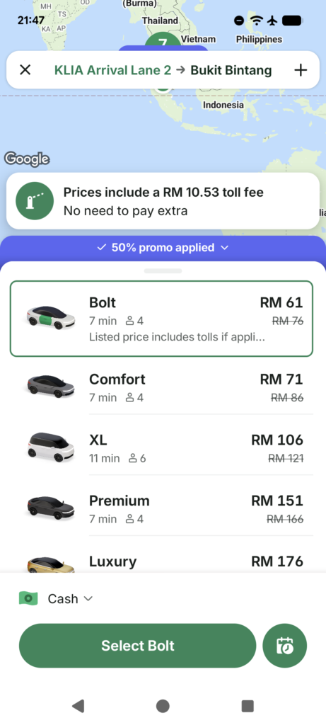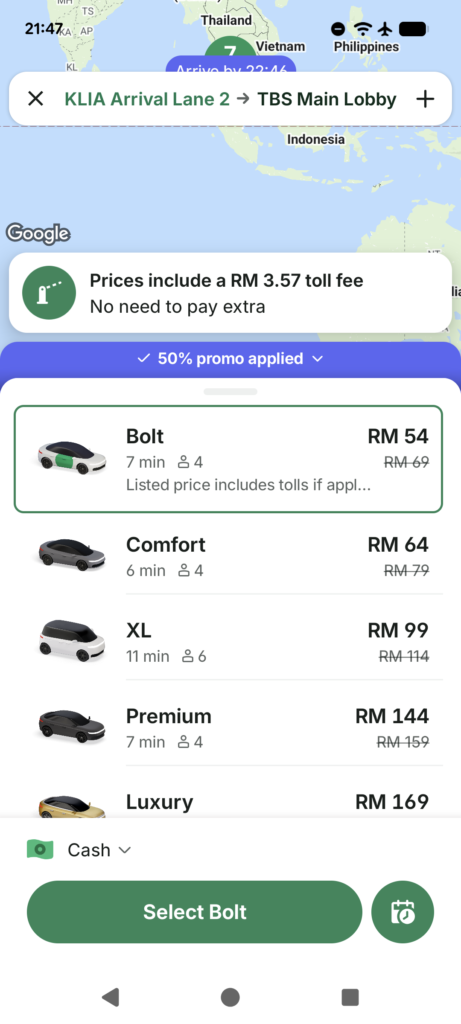 For ease and convenience, ride-sharing is hard to beat. From Kuala Lumpur International Airport, services like Bolt will take you straight to your accommodation — no transfers, no navigating stations, just door-to-door simplicity.