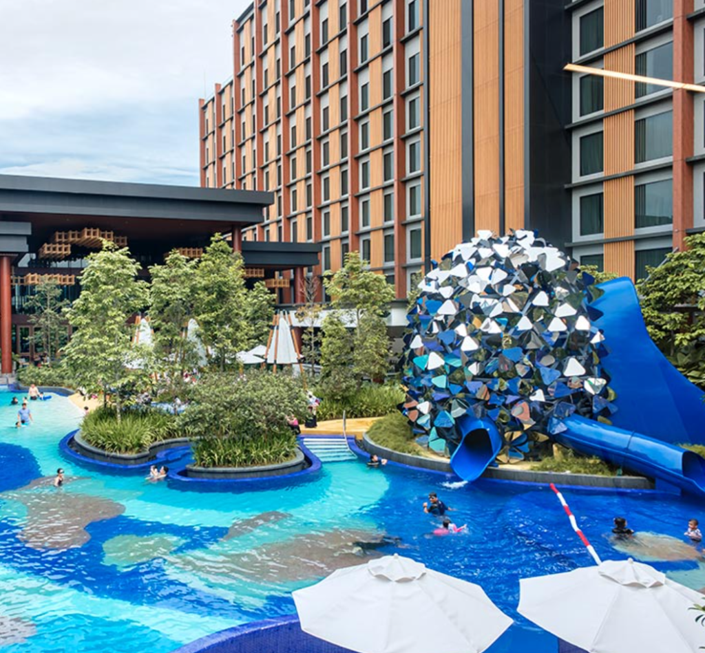 The pool remains the heart of the resort — a free‑form expanse where children race down hive‑shaped slides and adults find space to swim or simply float. It feels far removed from the city, a pocket of leisure where families gather and the weekend stretches long.