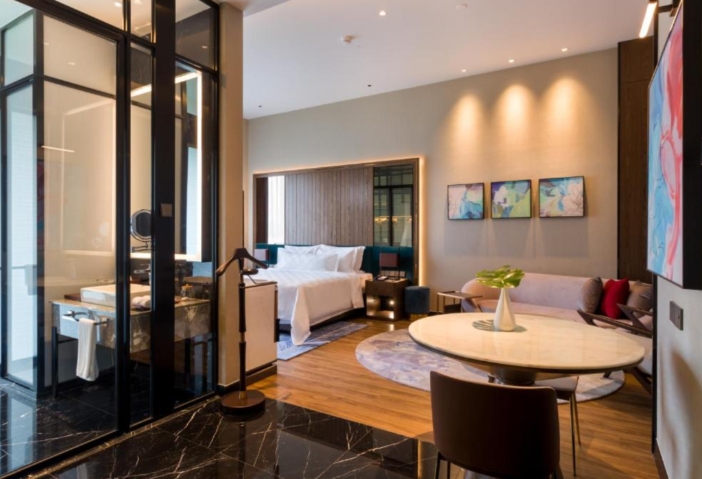 The suite itself is spacious, carrying the atmosphere of a modern studio home. A Nespresso machine and tea facilities, a dining table, a cosy sofa with coffee table, and a king bed dressed in plush linens create a balance of comfort and function. Modern touches — motion sensors for energy saving, universal sockets, USB ports — add convenience, while the bathroom speaks pure luxury. Black marble and glass frame the space, with twin marble washbowls lit by LED smart mirrors, a separate toilet cubicle, a bath area with a gleaming tub, and L’Occitane amenities that elevate the experience.
