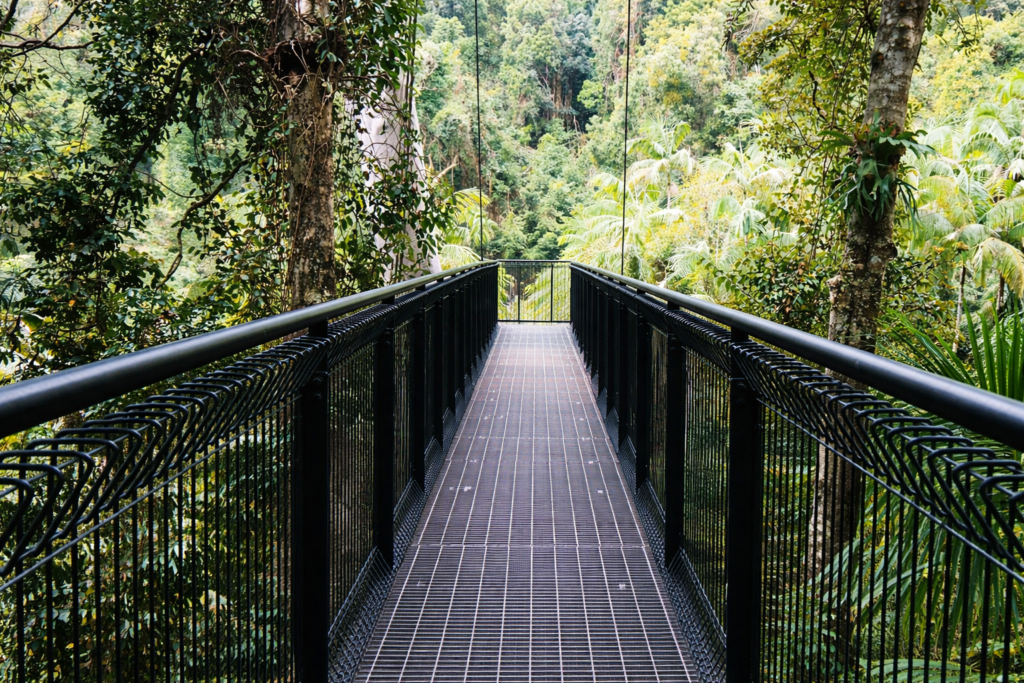 • Elevated Walkways: Steel bridges that glide through the treetops, offering bird’s-eye views of canopy and creek.