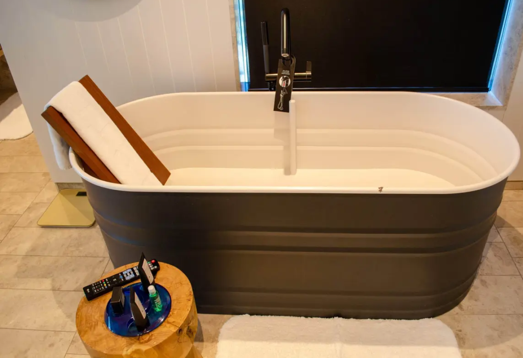 The bathroom is theatre: a trough‑shaped tub with a plank for lounging, a TV perfectly placed for cricket‑watching, twin sinks flanking a circular mirror, and a cheeky sliding door that offers more suggestion than privacy. It’s indulgent, playful, and unapologetically W.